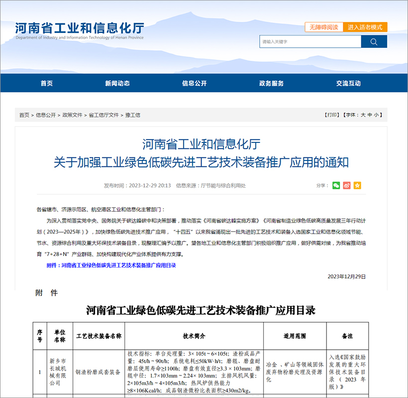 新鄉(xiāng)長城的“鋼渣粉磨成套裝備”入選工業(yè)和信息化部與生態(tài)環(huán)境部聯(lián)合編制的